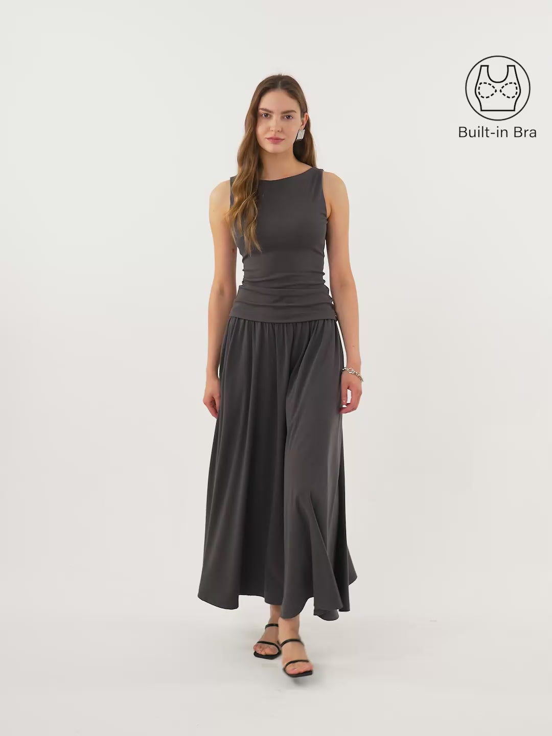 Our Boatneck Brami Tank is designed to complement your every move, featuring a slim fit and removable bra pads for comfort and support. You’ll love the elegant boatneck silhouette that makes styling effortless. Pair it with our Umbrella Maxi Skirt for a look that’s as chic as it is practical.