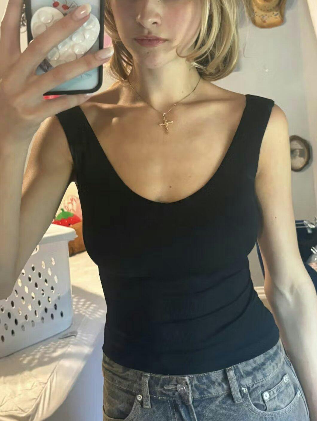 A neckline you’ll fall in love with. This slim-fit cropped top features a beautifully shaped V-neckline that frames you just right. With removable bra pads included, it’s an easy, flattering piece.