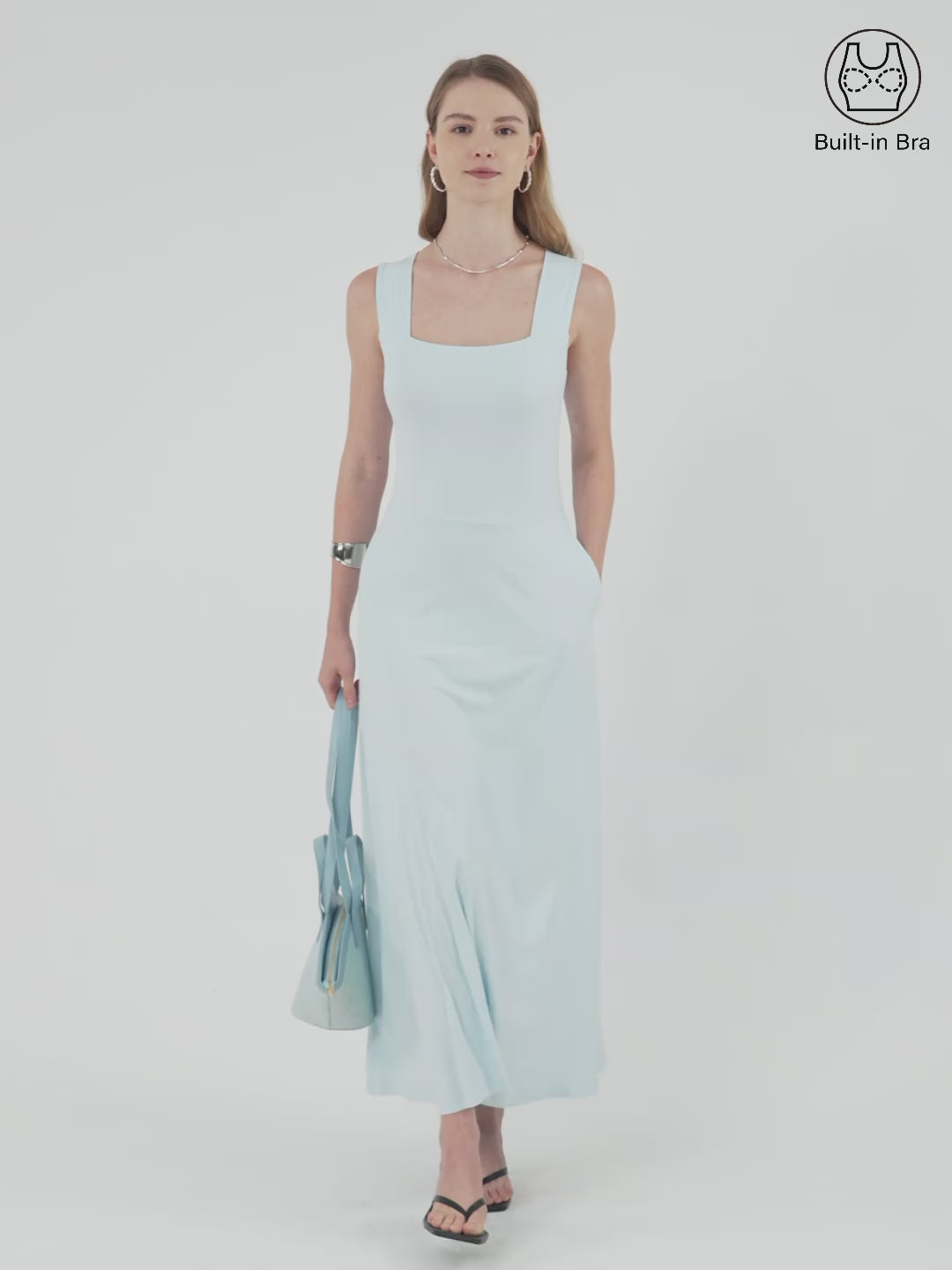 Clean lines, easy summer vibes. This slim-fit midi dress features a square neckline and wide shoulder straps for a flattering, structured look. With pockets and removable bra pads, it’s the go-to piece that keeps you cool and comfy.