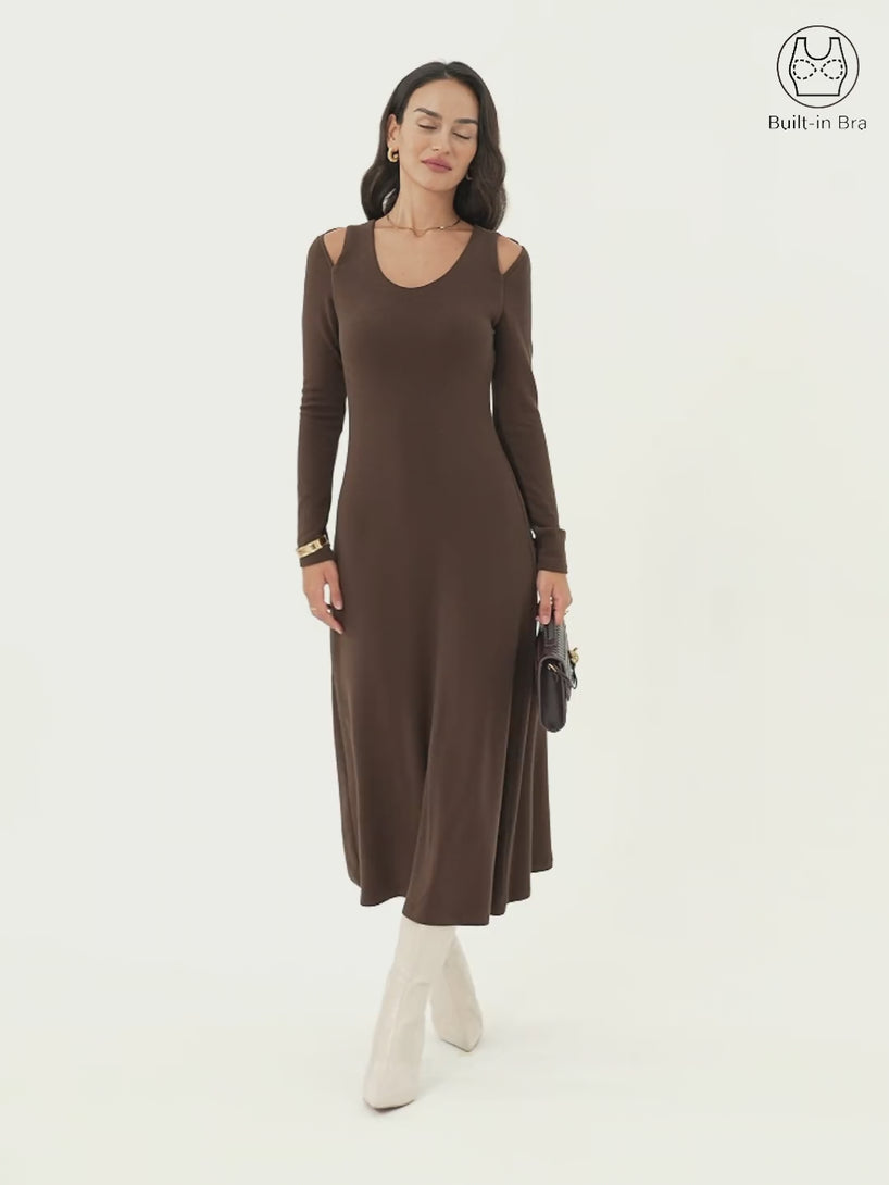 You’ll love this dress featuring a sleek cutout shoulder design that adds a modern, feminine touch. Made from softly brushed fabric for a cozy feel, it got finished with removable bra pads for comfort and support.