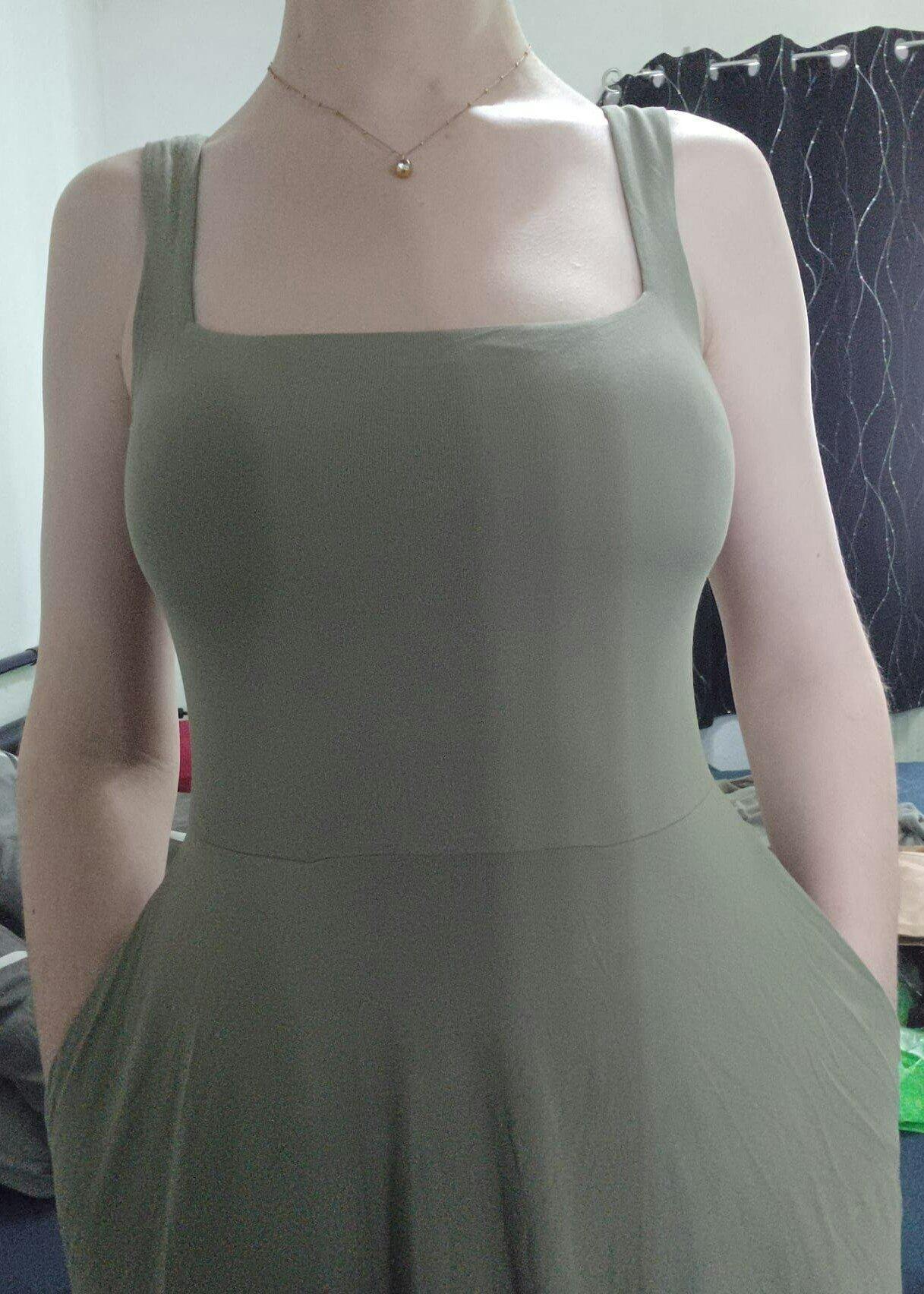 Love this dress. Built in bra, pockets. Only thing is I am very long waisted and it doesn’t go down to my waist. But if I would get a bigger size the overall would be too big.