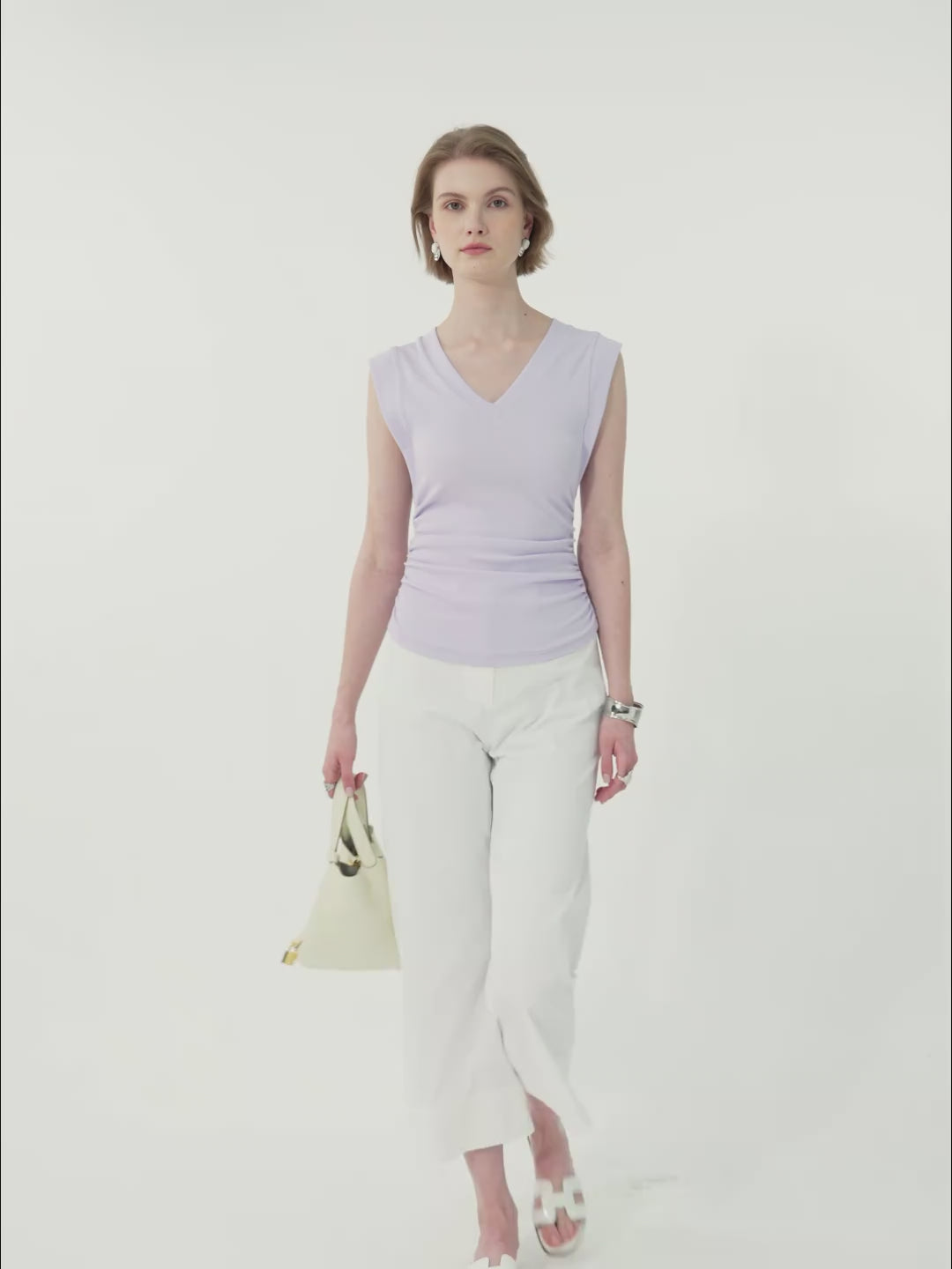 This slim-fit muscle tee hits at the high hip with wide shoulders, while side ruching adds a feminine touch. We added a discreet underarm panel to give you extra coverage—so you never have to worry about side peek.